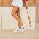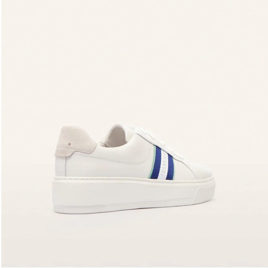 Take your sneaker collection to the next level with Riley in preppy White/Navy. A statement platform sole defines Riley—exaggerated yet sleek design made for high rotation wear. Riley features lightweight construction, an innovative support and cushion system, and laces made from recycled cotton. An elastic gusset enables them to be worn with or without laces. A luxe leather finish and eye-catching accents elevate this essential platform sneaker style.