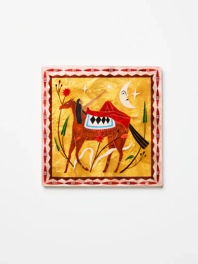 A dreamy tale in tile form. The Fable Horseback Pink Square features a hand-painted rider under the wistful moon, framed in desert pinks and gold. This square capiz wall tile feels like a moment from a storybook, captured mid-gallop.