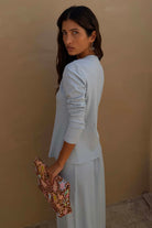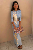 We've kept it simple with a baby blue ribbed button up cardi but added a touch of NFD flare with our sun print! Hand painted by our in-house design team and inspired by our adventures in Sóller, Spain. Pair with the matching midaxi skirt for for the perfect throw on co-ord.