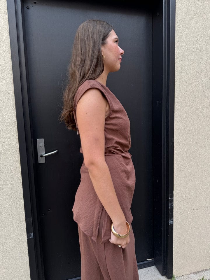 Effortlessly chic and versatile, this sleeveless brown top features a soft, crinkled cotton feel with a flattering waist tie.
