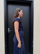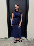 Effortlessly chic, the Midnight Ease Set features a sleeveless tie-waist top and matching A-line skirt in a textured navy fabric.