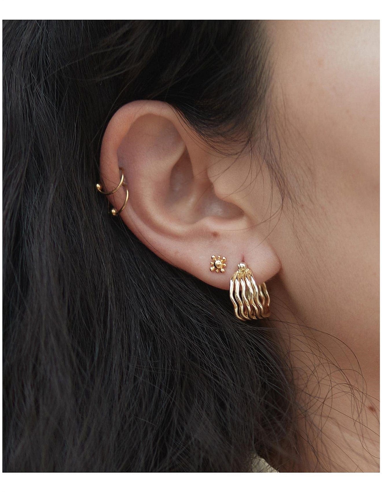 Elevate your everyday look with these Five Waves Hoop, crafted from a high-quality brass and finished with a thick 1-micron layer of 14ct gold plating for lasting shine and durability.