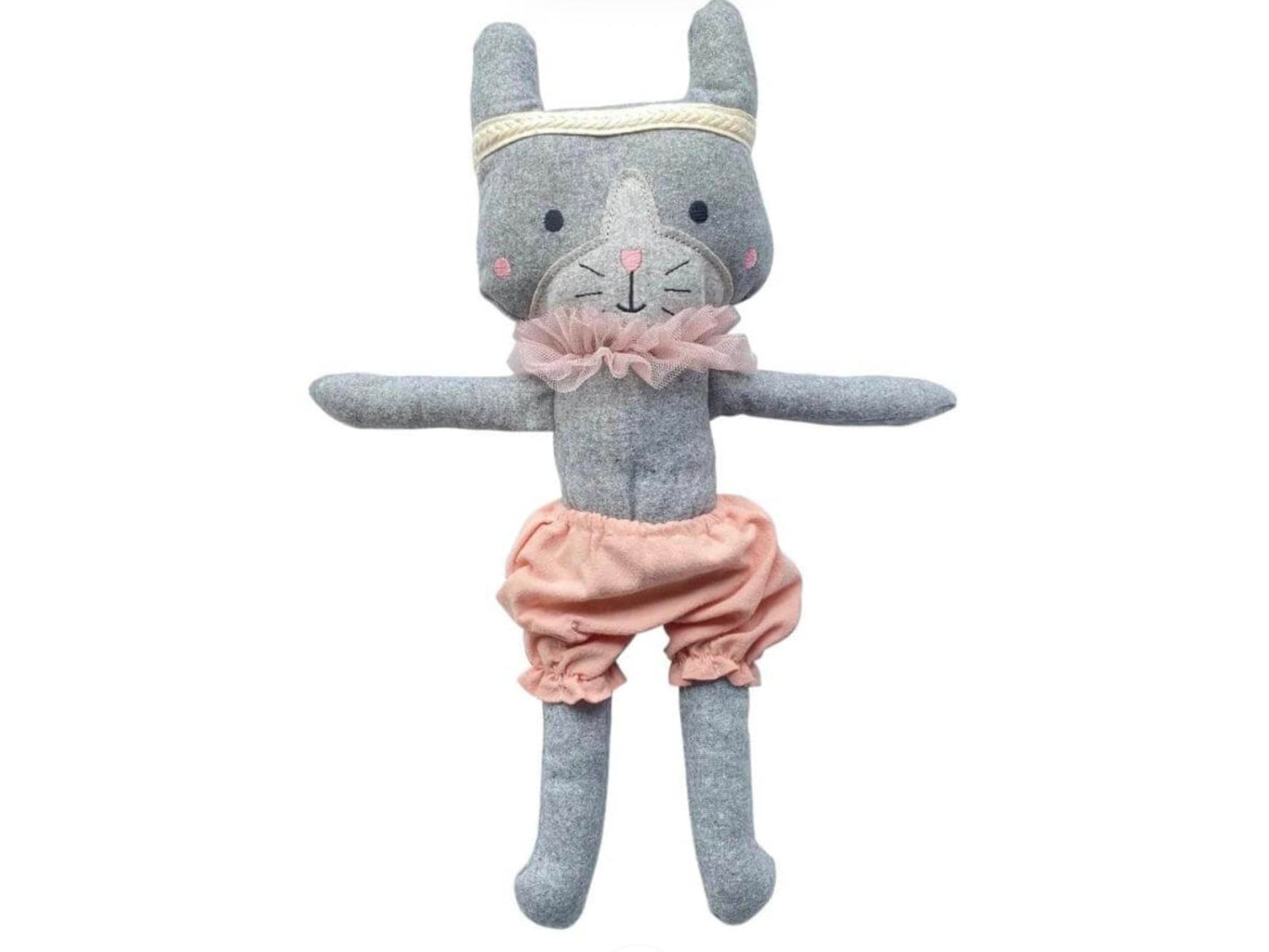 Made with the softest wool blend fabric. Polly wears pink shorts and has a sheer pink netting neck band with a wool headband along with pink stick he’d cheeks annd nose.